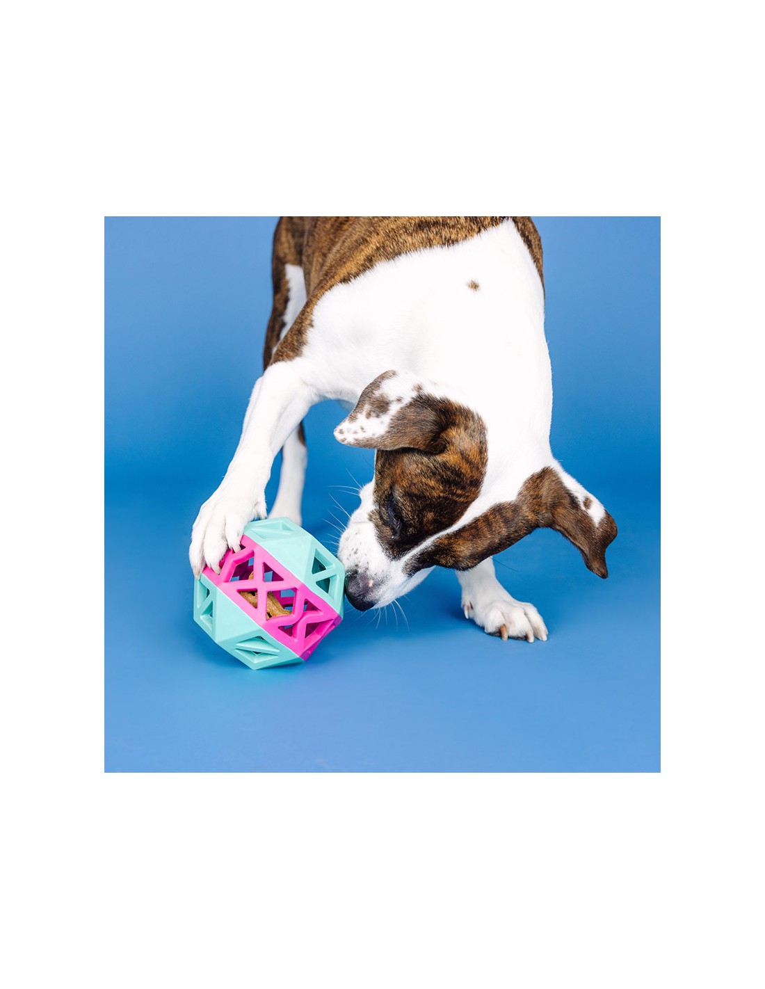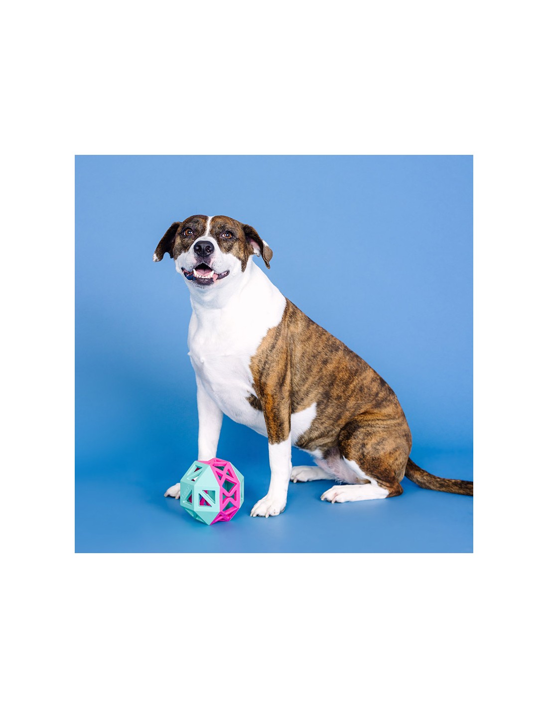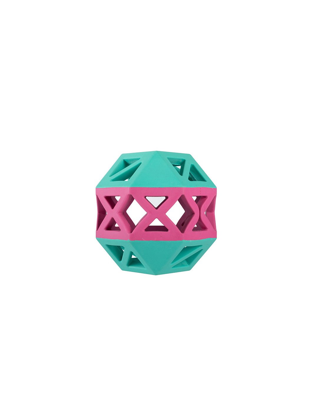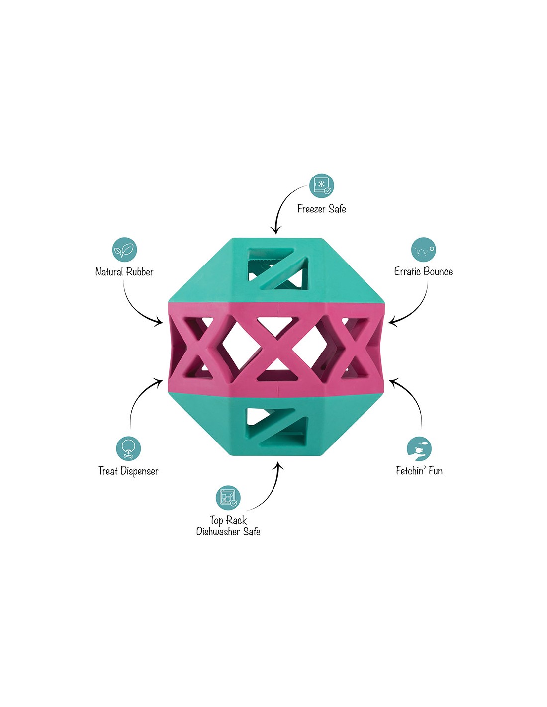 Ready to join the Dura Club? The "This Is How I Roll" rubber dog toy from Fringe in turquoise and bright pink is for pups who like to work for their treats, chew and retrieve a lot. Made from natural rubber, with a treat dispenser and a whimsical bounce function, this toy is made for long-lasting interactive play. Just fill it with treats or thread it with a bully stick, then throw it for some fetch fun so your pup is busy getting them out. Ideal for dogs of all sizes and strong chewers. Dim. 5 x 4.5 cm. Treat dispenser + retrieving + biting + natural rubber + floating + dishwasher safe + freezer safe + irregular bounce. Packed per piece.