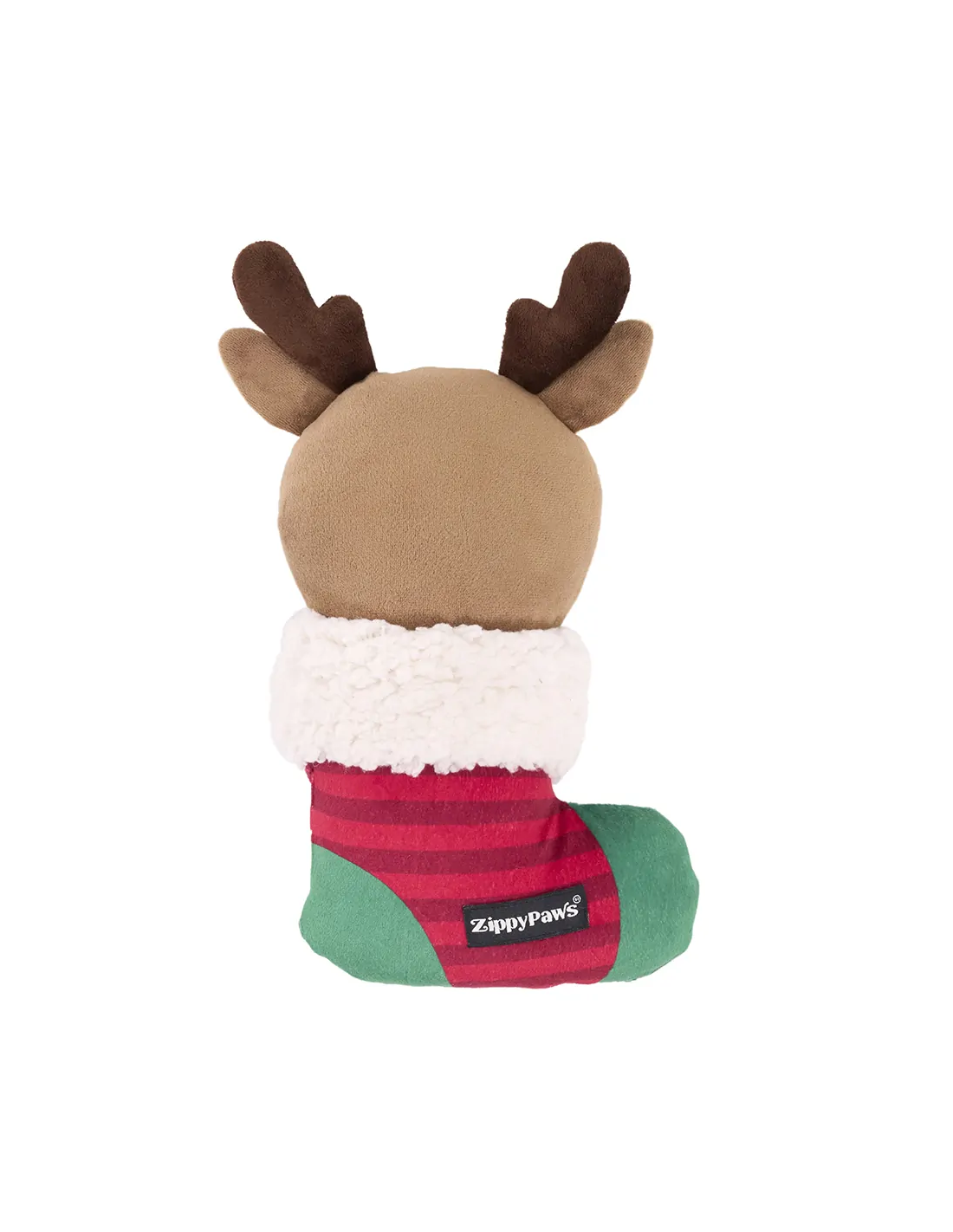 Celebrate the holiday season with the ecoZippy Holiday Stocking Reindeer plush dog toy! ecoZippy toys from ZippyPaws put an eco-friendly twist on your dog's playtime! Constructed using durable eco-friendly natural materials, ecoZippy toys are perfect for playing with your environmentally conscious pup. The ecoZippy Holiday Stocking Reindeer features a sherpa details with crinkle inside. Embroidered hands popping out of the stocking. Includes 1 round squeaker and contains stuffing. ZippyPaws uses stuffing made from 100% recycled materials.