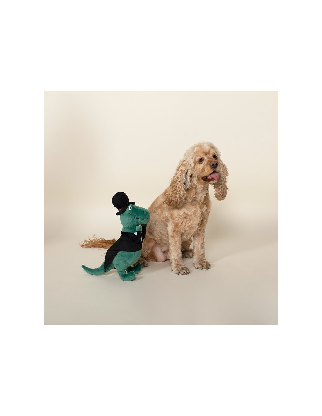 Dino en peluche avec smoking et chapeau. Coineur extra fort. Dim. 29x25cm. Emballé par pièce.