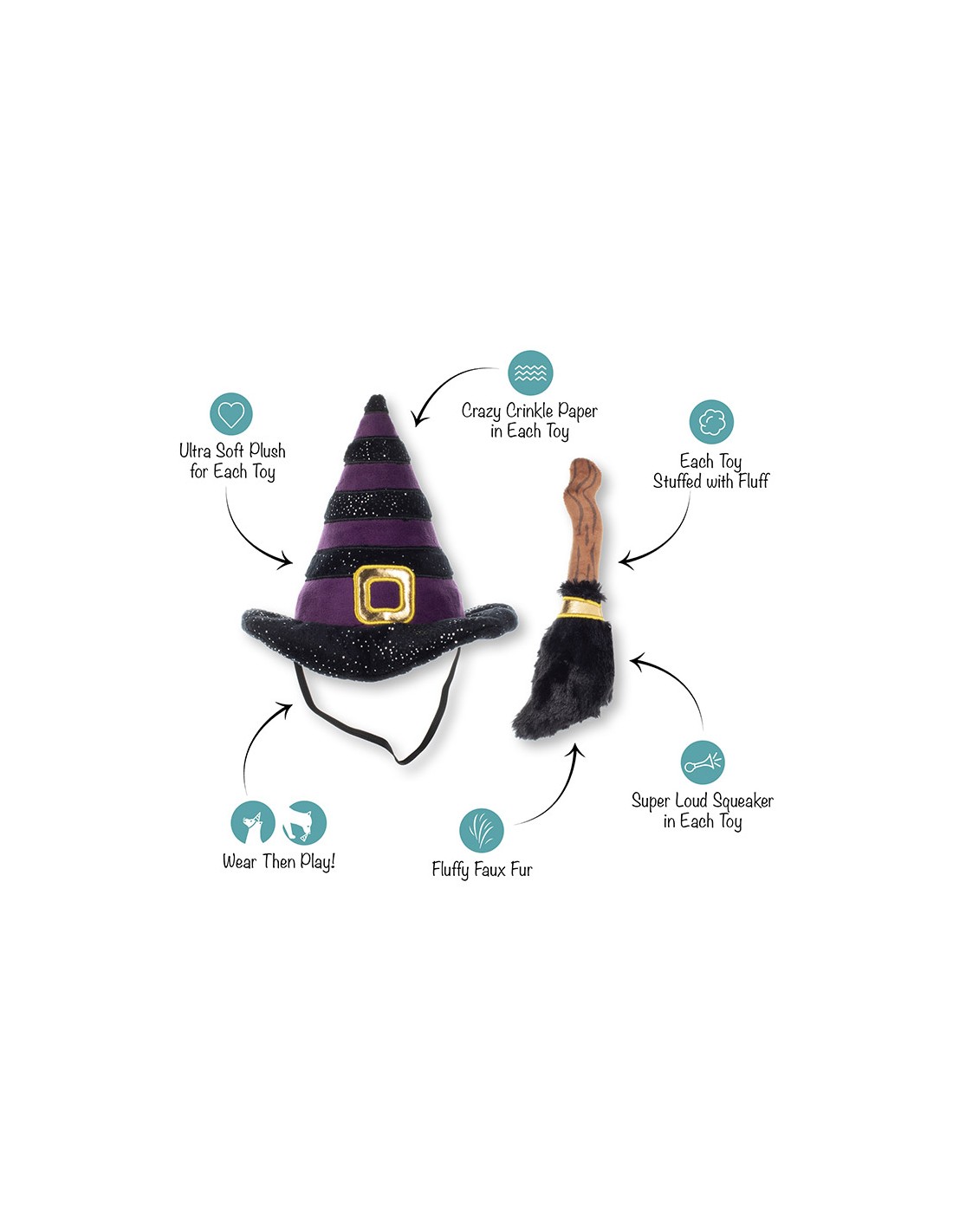 Dim. Chapeau 20,5 x 12,5 x 12,5 cm. Dim. Balai 21,5 x 4 cm. Couineur extra fort dans le chapeau + papier froissé. Couineur fort dans le balai + Papier froissé. Emballé par ensemble.