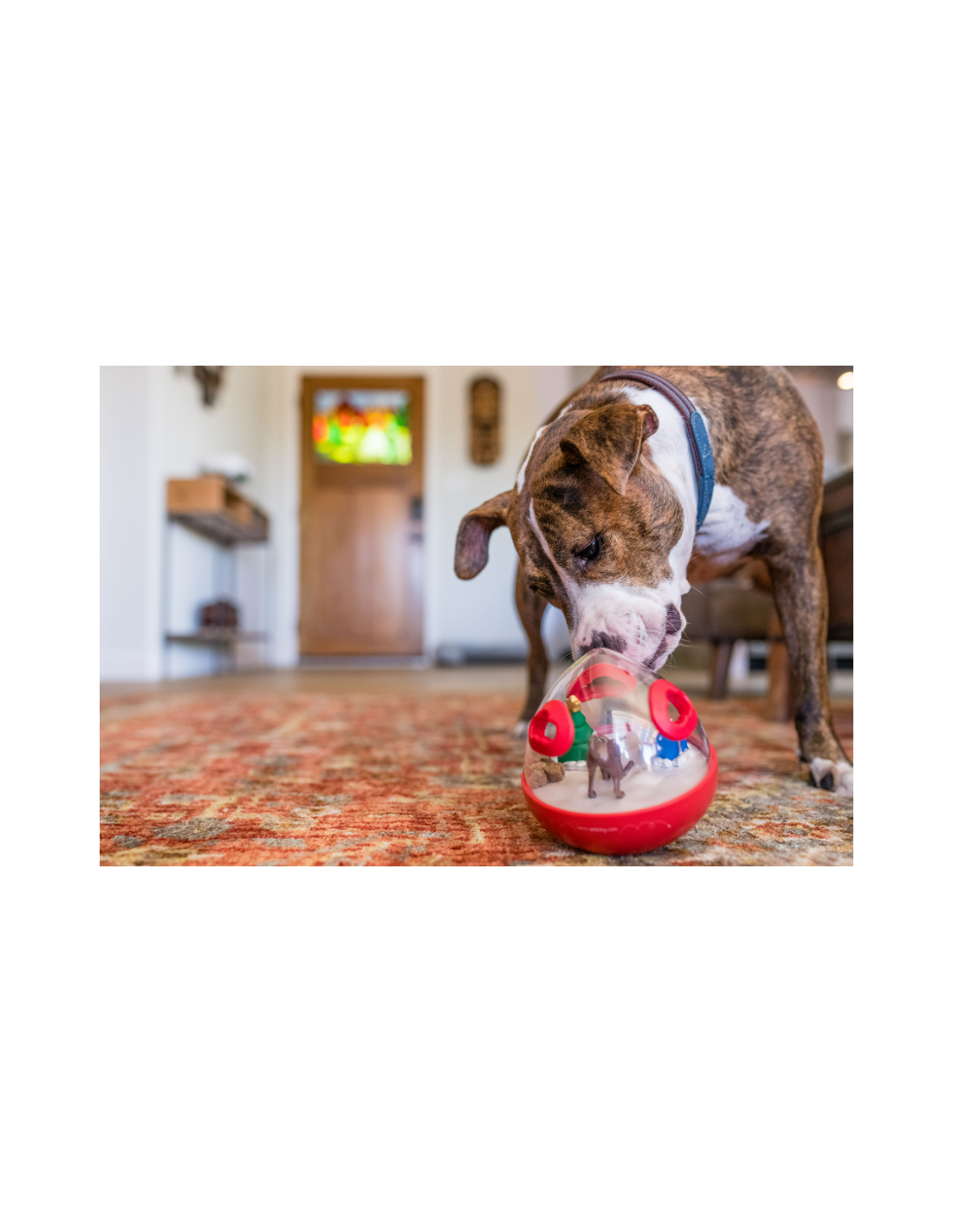 Jouw hond houdt van spelen, en niets is leuker dan traktaties! De Wobble Ball™ speeltje combineert spelen en mentale stimulatie tot het perfecte verrijkingsspeeltje, dat de zintuigen van uw hond stimuleert. Het interactieve puzzelspeeltje heeft een unieke vorm en geeft het geluid en zicht van traktaties die binnenin ronddraaien, waardoor het onvoorspelbaar rolt en bijdraagt aan het vermaak van je harige metgezel. Steek gewoon de lekkernijen of brokjes van je hond erin en kijk hoe ze zowel mentaal als fysiek actief blijven terwijl ze proberen om de heerlijke beloningen te pakken te krijgen. Je hond zal genieten van dit speeltje dat traktaties afgeeft!