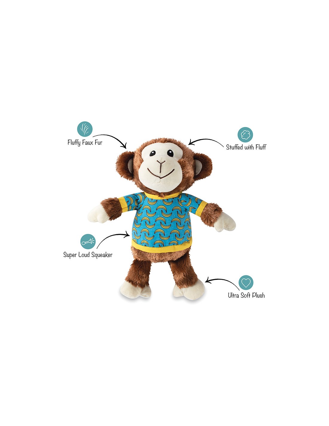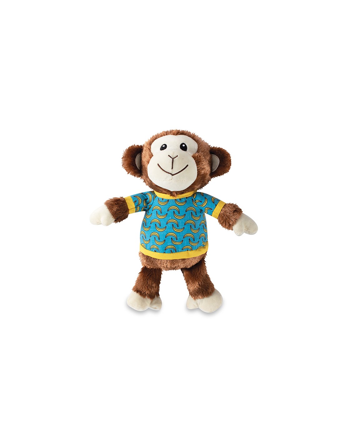 Pluche Aap met bananenshirt aan. Extra luide pieper. Afm. 27x23cm. Per stuk verpakt.