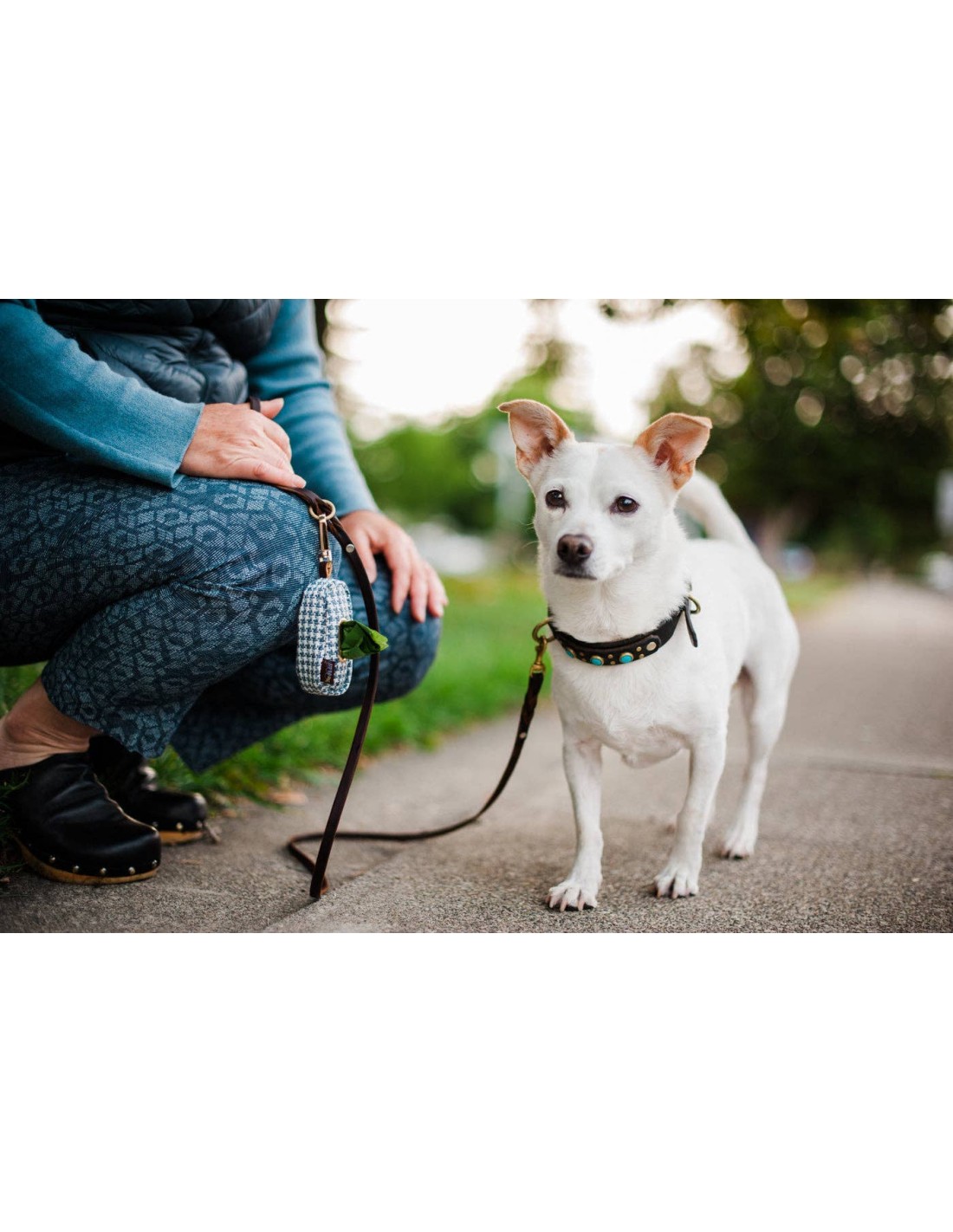 Your New Favorite Dog Waste Bag Holder When you clip P.L.A.Y.’s stylish Proper Pup dog poop bag holder onto your dog’s leash or belt loop, you’ll never be caught empty-handed when you need to clean up after your furry friend. This durable, lightweight dog bag dispenser is made from upcycled materials, features a zippered pouch compartment that securely holds up to 15 poop bags at a time and makes reloading a breeze! Our subtle cloth dog bag carrier comes pre-filled with a roll of Earth Rated dog bags and can clip on to any leash. Features of the Hands-Free Proper Pup Poop Bag Dispenser: * Available in eight sleek looks made from durable upcycled fabrics found in our premium bedding * Lightweight and compact measuring at 3.
