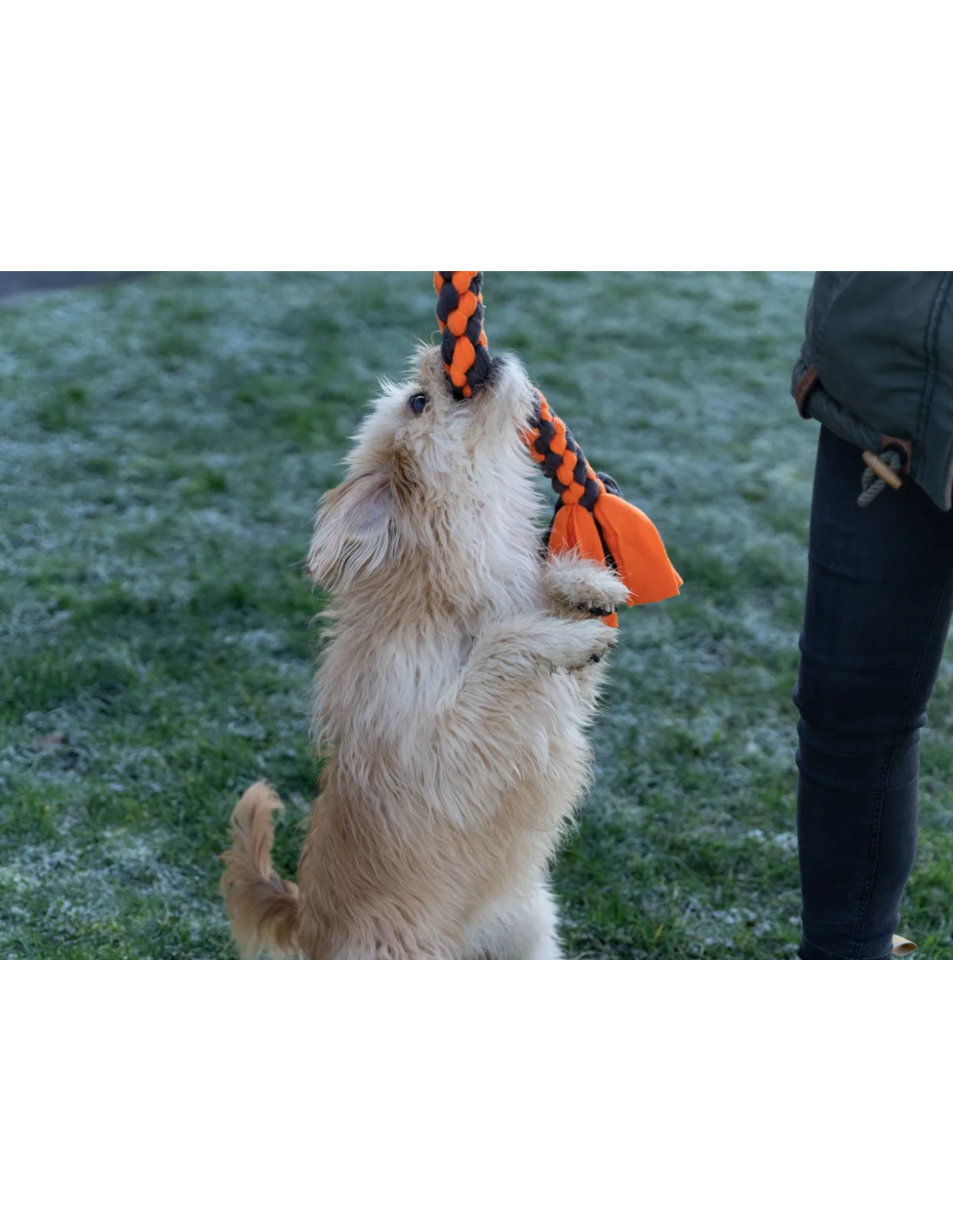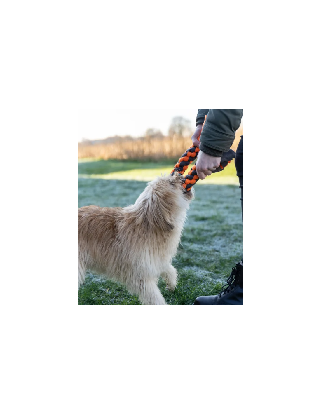 Voor het beste grip en controle pak je de Zergel aan beide uiteinden vast. Afhankelijk van de hond kan het speeltje natuurlijk ook prima door twee honden tegelijk gebruikt worden, die samen tegen elkaar trekken.