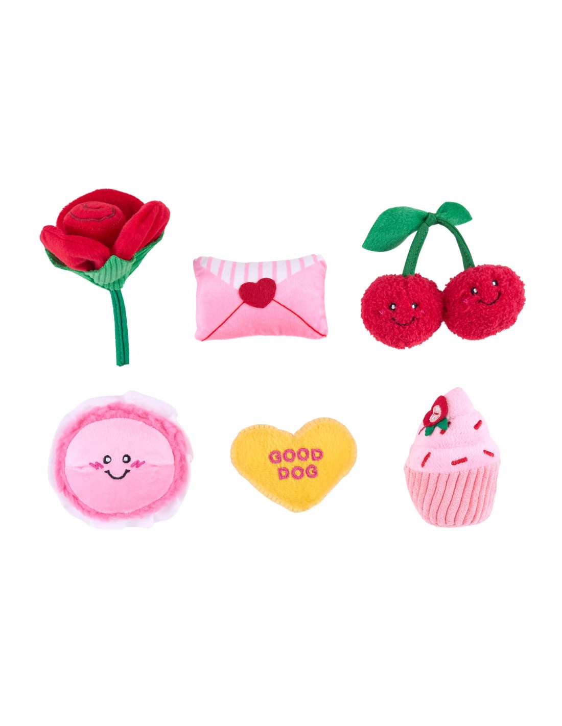 Geef je pup een beetje liefde met de Sweet Treats Miniz 6-pack! Perfect om de Miniz te vervangen in de favoriete Zippy Burrow® van je hond - of als leuke speeltjes voor je kleine hond - deze verpakking bevat 6 van de leukste Miniz hondenspeeltjes. Zippy Miniz zijn kleine piepspeeltjes, speciaal gemaakt voor gebruik in Zippy Burrow® speeltjes. Elk schattig Miniz speeltje bevat vulling en een ronde pieper. Perfect formaat voor de bekken van kleine honden. Inclusief Cupcake, Kersen, Macaron, Snoephart, Roos en Liefdesbrief Miniz. 1 ronde pieper in elk. Diverse stoffen, kreukels en geborduurde details.