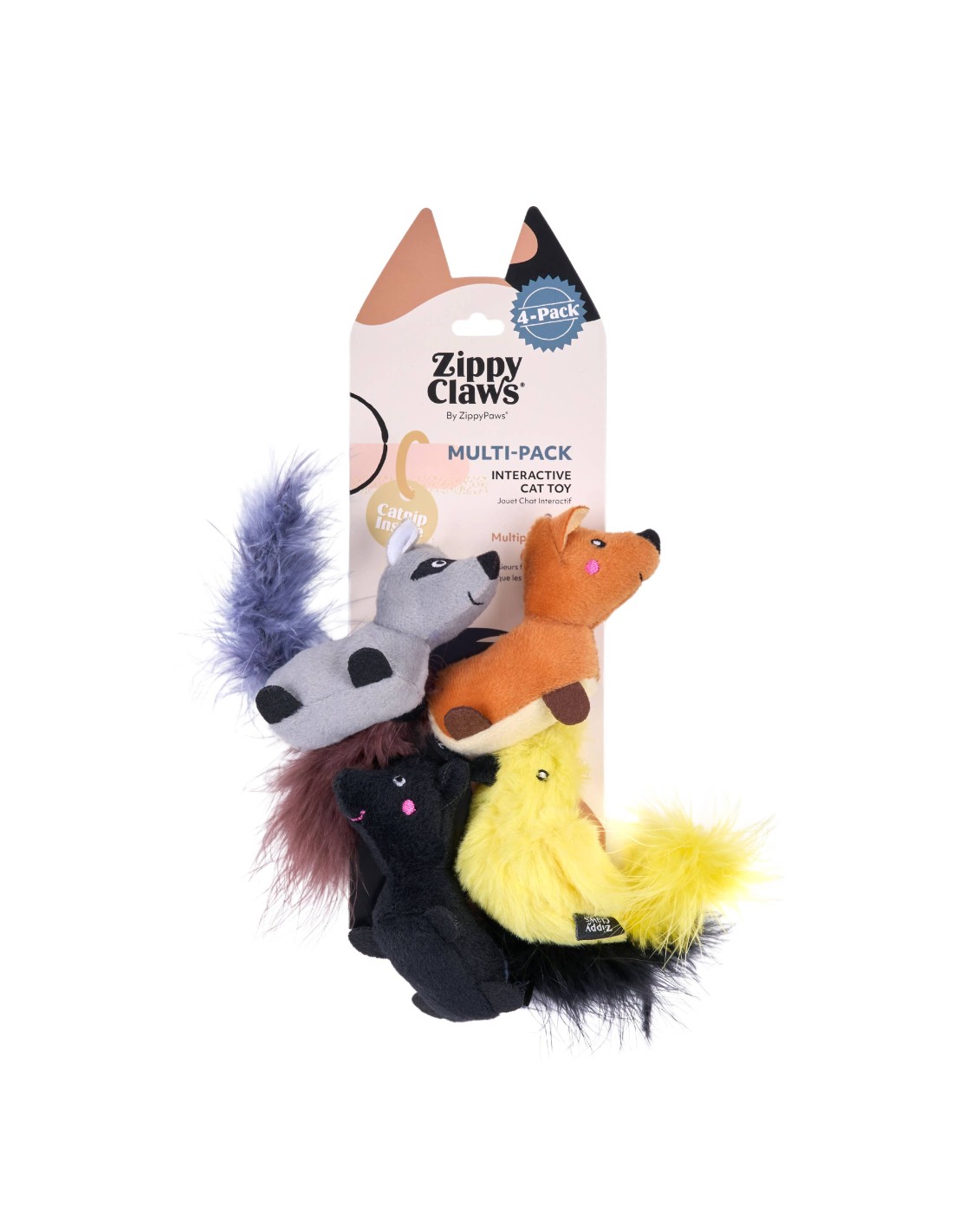 Prikkel het natuurlijke jachtinstinct van je kat met de ZippyClaws® 4-Pack Critters. Ze zullen dol zijn op het slaan, achtervolgen en springen op deze vier kleine vriendjes met gevederde staarten. Deze speeltjes bevatten bovendien knisperend materiaal en kattenkruid aan de binnenkant, wat de zintuigen van je jager zal stimuleren en aanzetten tot spelen. De set bevat 4 Critters (wasbeer, vogel, stinkdier, aardeekhoorn) met pluizige verenstaarten, knisperend materiaal en kattenkruid aan de binnenkant.