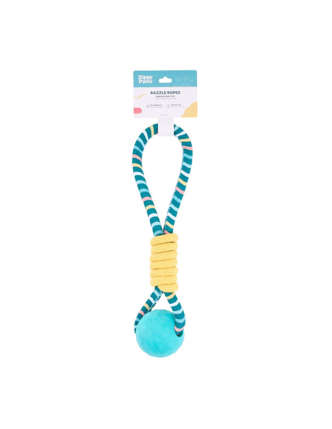 Voor honden die graag een beetje razzmatazz spelen, is de felgekleurde Razzle Rope Tugger van ZippyPaws het perfecte speeltje! Het opvallende ontwerp straalt speelsheid uit en de duurzame constructie is bestand tegen urenlang apporteer- en trekplezier. De duurzame Razzle Rope Tugger is gemaakt van een bedrukt touw met ons speciale golvende strepenpatroon en felgele katoenen touwdetails – plus een bijgevoegde ZippyTuff Waggle Ball van duurzaam TPR-materiaal. Gemakkelijk vast te pakken. Het bedrukte touw is voorzien van katoenen touw aan de binnenkant.