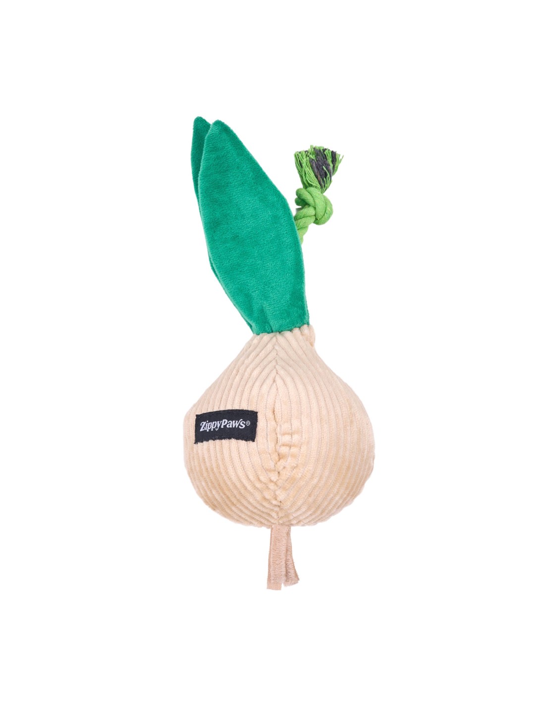 De pluche Crinkle Crops Ui bestaat uit een mix van stoffen, knisperende bladeren en een katoenen touw dat bovenaan uitsteekt. Inclusief 1 grote ronde pieper.